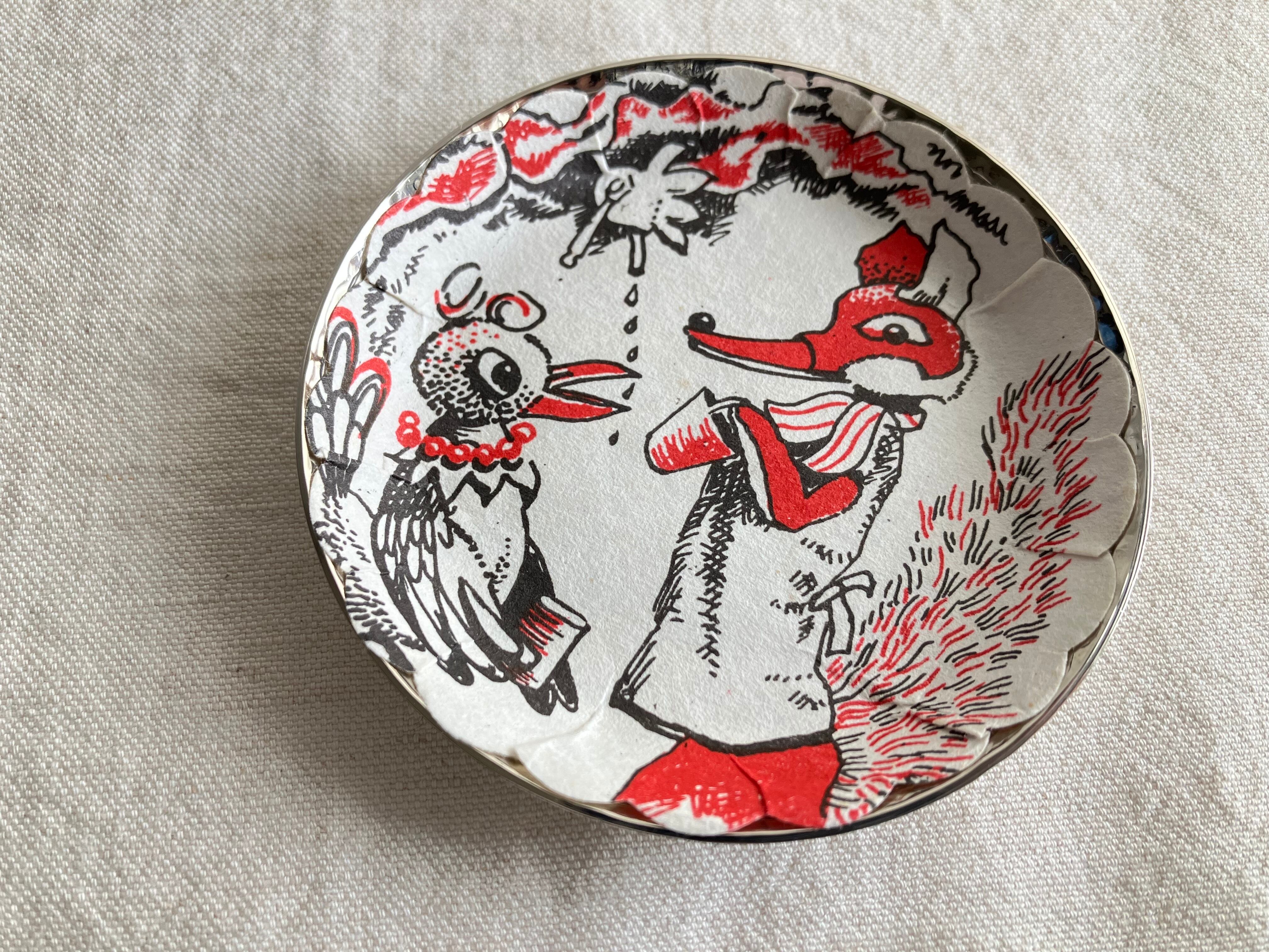 旧東ドイツ時代からの人気キャラクター「ザントマンSandmann」のお友達「キツネのHerr Fuchs」と「カササギのフラウエルスターFrau Elster」のペーパーコースターがのったメタルの打ち出しコースター。